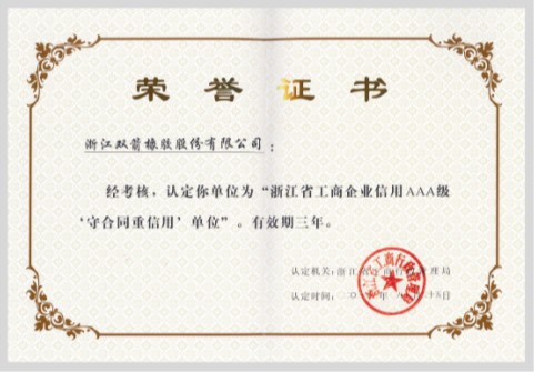 日前,我公司再次被浙江省工商行政管理局续展认定为“浙江省工商企业AAA级‘守条约重信用’单位”。