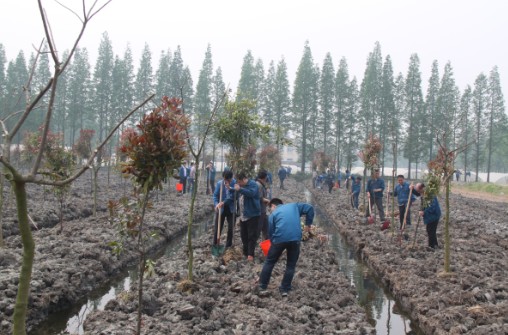 4月17日上午,在洲泉镇众安村一片刚刚翻土完毕的逍遥上,几十名身穿蓝色事情服的企业员工捋起袖子,挥舞铁锹,战战兢兢地栽种着一株株树苗。这片占地32亩的片林又名“中欧体育林”。